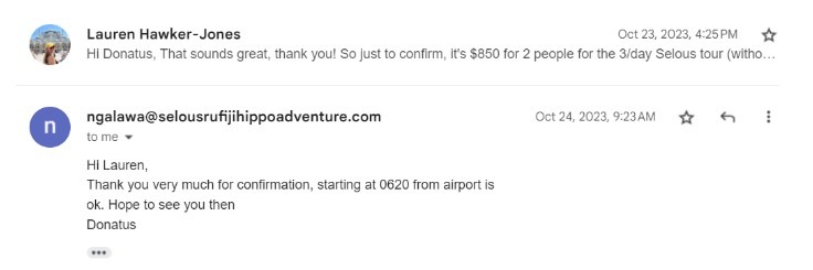 Not to let the only reasonably priced safari slip away, we decided to reach out and ask if we could skip the village. Turned out, we could! But not only that, they even gave us a lil’ discount for booking three people. The final price they offered was £312 ($390 USD) per person.
